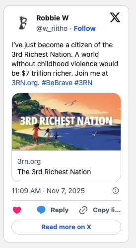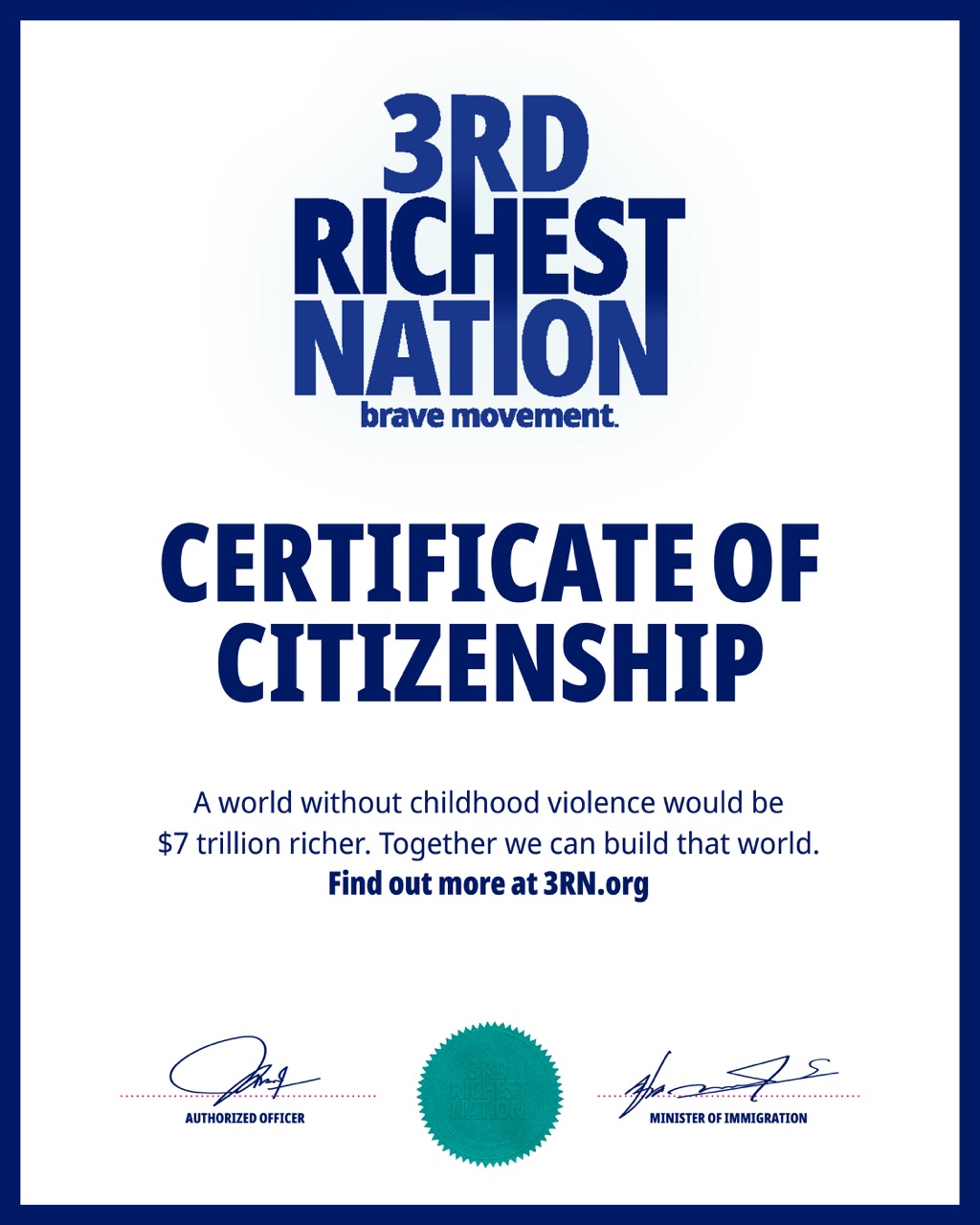 I’ve just become a citizen of the 3rd Richest Nation. A world without childhood violence would be $7 trillion richer. Join me at 3RN.org. #BeBrave #3RN